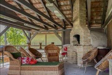 A detached summer kitchen on the property is perfect for processing home-grown fruits and vegetables. The courtyard features a cozy terrace equipped with an oven, creating an excellent space for outdoor grilling, friendly gatherings, or simply relaxing. The garden boasts fruit-bearing trees, including plums, pears, and peaches, ideal for home fruit cultivation enthusiasts.