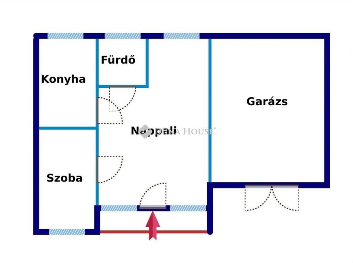 Az épület áll ~ lakótér, háló, konyha, fürdőszoba és garázs helyiségekből.