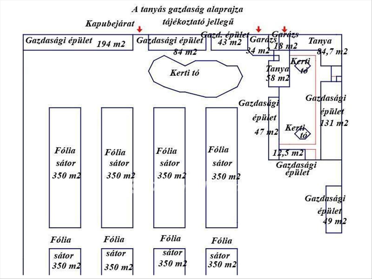 Pest vármegye, Cegléd, Ugyer dűlőben 84, 7 m2 hasznos alapterületű családi ház, 58 m2 külön bejáratú lakóépülettel, kettő garázzsal, 653 m2 nagyságú, több egységből álló gazdasági épülettel, 8 db 350 m2-es fóliasátorral működő kertészeti gazdasággal, összesen 17. 158 m2 telken eladó. Az 1979-ben épült, tégla falazatú családi házban egy nappali, három szoba, kettő félszoba, egy konyha, egy fürdőszoba-WC helyiség, egy spájz, egy tároló és egy 28 m2-es terasz kapott helyet. Az 58 m2 külön bejáratú lakórész egy előszobából, egy közlekedőből, és kettő - jelenleg tárolóként üzemelő - szobából áll. Az ingatlanhoz tartozó legközelebbi gazdasági épület emeleti részén három - összesen 78 m2 területű - szoba lett kialakítva. a családi ház nappalija és fürdőszoba-WC helyisége járólap-, a többi helyiség pvc- burkolatot kapott. a lakóépület helyiségei közül az előszoba és a közlekedő járólap-, a két tároló egyéb burkolatot kapott. a családi ház külső nyílászárói dupla rétegűek, műanyagból készültek. a két kisebb világító ablak fa szerkezetű. a belső nyílászárók eredetiek, fából készültek. a lakóépület külső- és belső nyílászárói eredetiek, fából készültek.A közművekből a telken belül megtalálható a (3x16A) ipari áram és a gáz. a vízellátást három fúrt kút biztosítja: a lakórészt házi vízművön keresztül, a mezőgazdasági terület öntözését nagy teljesítményű szivattyún keresztül. a gáz a telken belül található, az épületbe nincs bevezetve. a szennyvíz tárolására kettő emésztő tároló lett kialakítva. a szemét szállítása az utcában megoldott. Az épület homlokzata jó állapotú, szigetelt. Tetőszerkezete fából készült, ép, beázástól mentes, a héjazat égetett cserép borítást kapott. a ház komfortos, az otthon melegét kandalló és cserépkályhák biztosítják. a melegvizet villanybojler szolgáltatja.