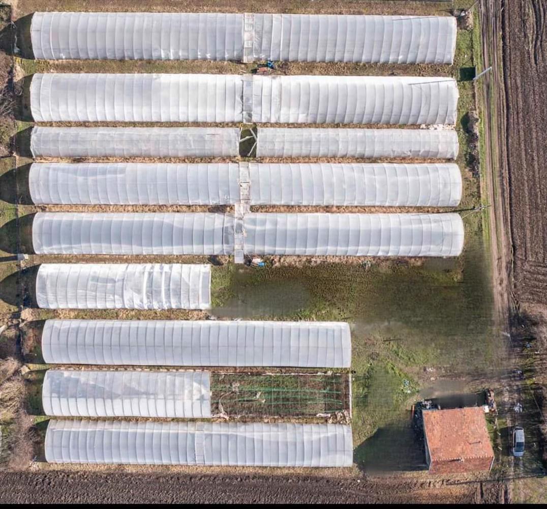 A tanya 3 db építési telek összevonásával közel 6000 m2 (77, 29 m x 76, 67 m). a 9 db fóliasátor (5 db 70 m-es, 3 db 50 m-es és 1 db 35 m-es) alapterülete összesen 3798 m2.