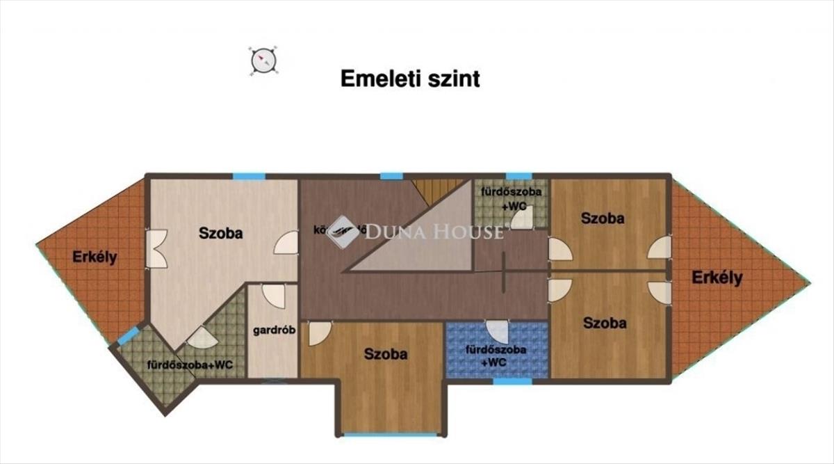 Emelet: galériás közlekedő, 4 hálószoba, 3 fürdőszoba WC-vel, 3 gardrób