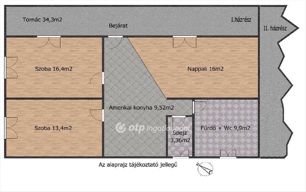 Az első lakrész elrendezése: 2 tágas, világos szoba, amerikai konyhás nappali, valamint fürdőszoba + mellékhelyiség.