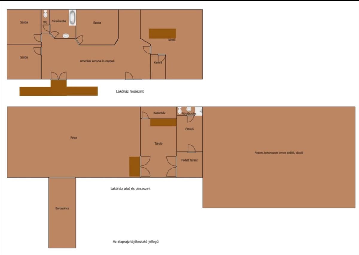 Alsószint: 185 nm , nagyméretű pince (121 nm ), borospince, kazánház, tároló, fürdőszoba, öltöző, amely nyári konyhaként is hasznosítható, terasz. Az épület folytatásában közel 200 nm lemezszerkezetű, betonozott, 6 méter belmagasságú, fedett beálló, tároló található.