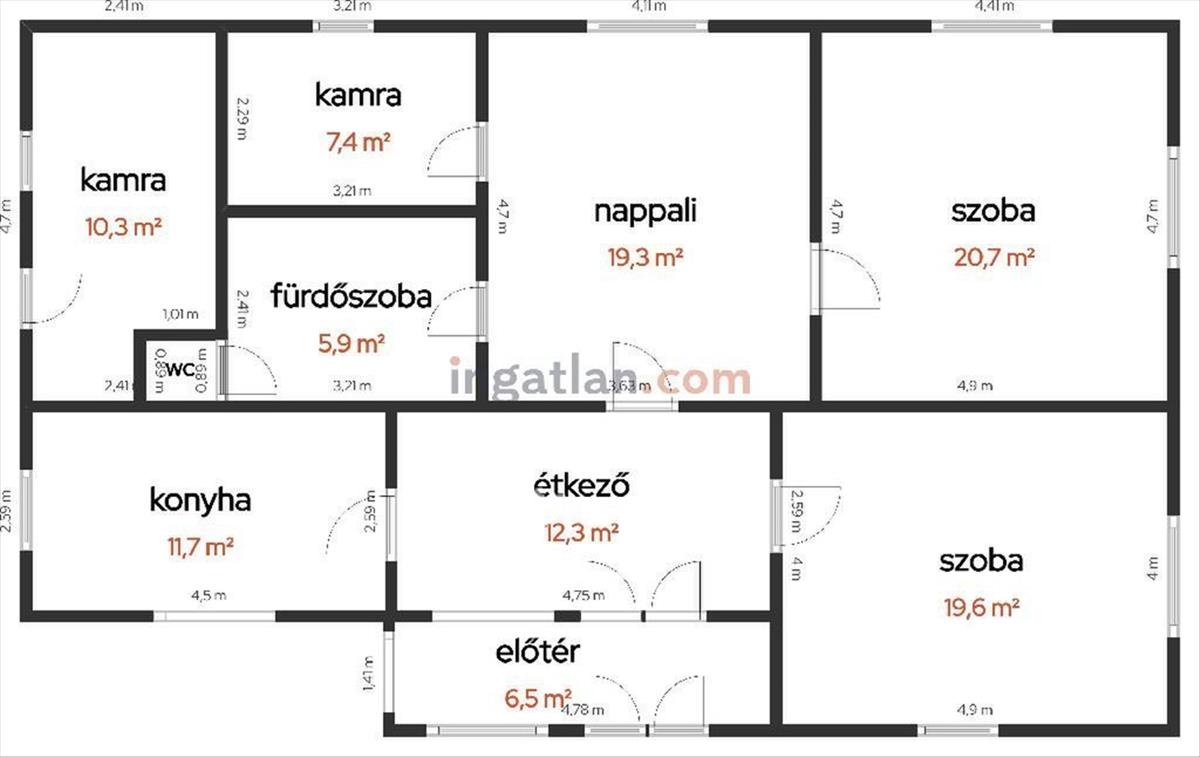 A lakóingatlan 115, 7 nm hasznos alapterületű, tartozik hozzá 2 szoba + nappali, étkező, konyha, 2 kamra, fürdőszoba + külön WC.