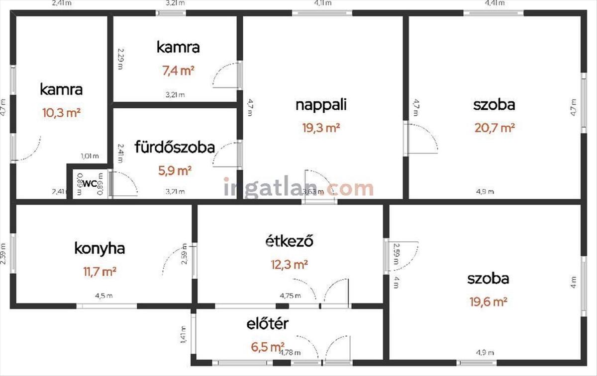 A lakóingatlan 115, 7 nm hasznos alapterületű, tartozik hozzá 2 szoba + nappali, étkező, konyha, 2 kamra, fürdőszoba + külön WC.