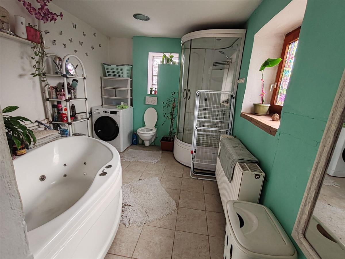 A fürdőszoba-WC burkolata kerámia járólap itt található egy tusoló, sarokkád, wc, mosógépleállás.