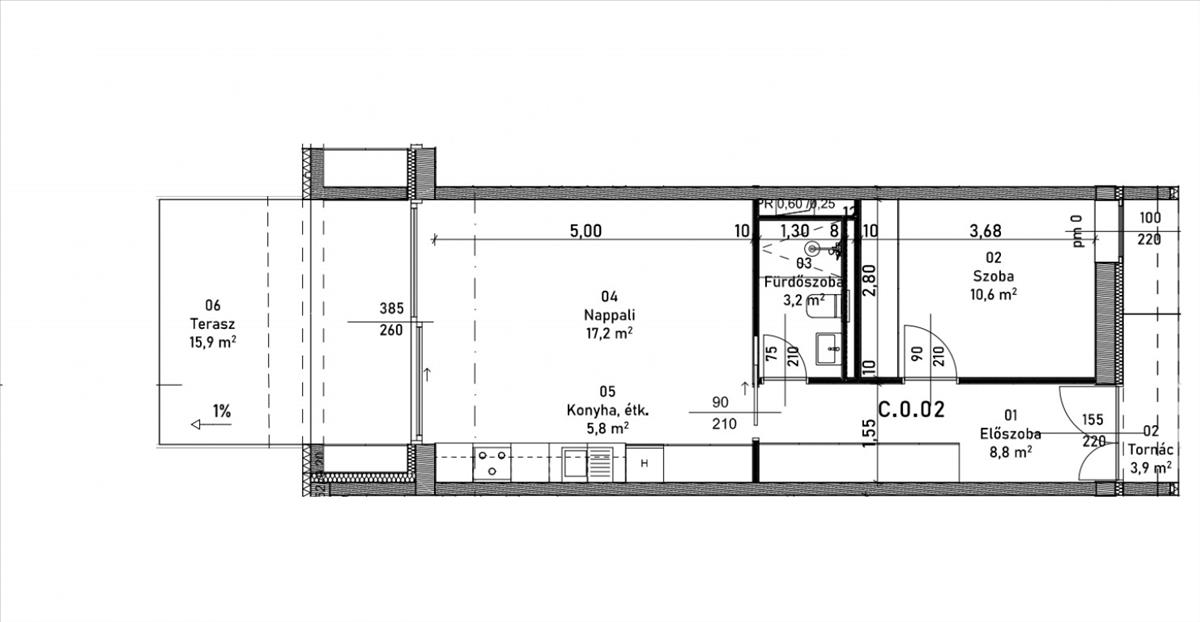 01 Előszoba 8, 8 m2 02 Szoba 10, 6 m2 03 Fürdőszoba 3, 2 m2 04 Nappali 17, 2 m2 05 Konyha 5, 8 m2 06 Terasz 15, 9 m2