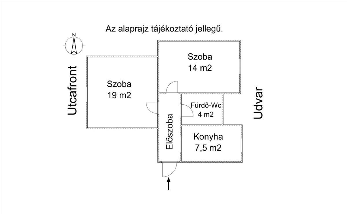 Az ingatlan elrendezése: két, franciaerkélyes szoba, konyha, előszoba, valamint fürdőszoba és wc egyben.