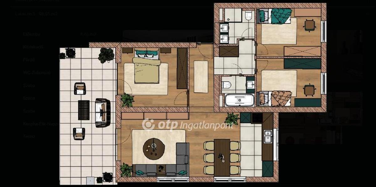 A projekt lakásai tágas amerikai konyhás nappalival, kényelmes hálószobákkal és saját terasszal rendelkeznek, kialakításukban a korszerű technológia és a gondos tervezés dominál. a bemutatott ingatlan egy földszinti, világos, teraszos lakás amely praktikus elrendezésével és jó helykihasználásával ideális választás lehet állandó otthonnak vagy nyaralónak.