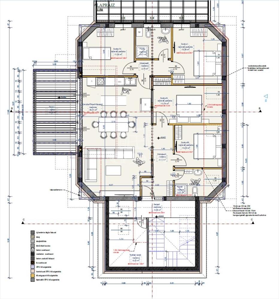 - a bruttó 140 m² alapterületen praktikus elrendezésű, világos, élhető terek kerültek kialakításra: 4 szobával, tágas amerikai konyhás nappalival, fürdőszobával, WC-vel, előtérrel.