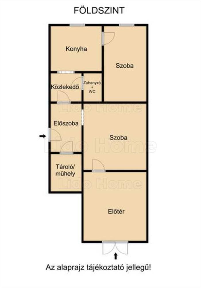 -Földszint: egy szoba, egy konyha, zuhanyzó + wc, tároló, két tágas helyiség, mely szobaként, előtérként és tárlóként is használható