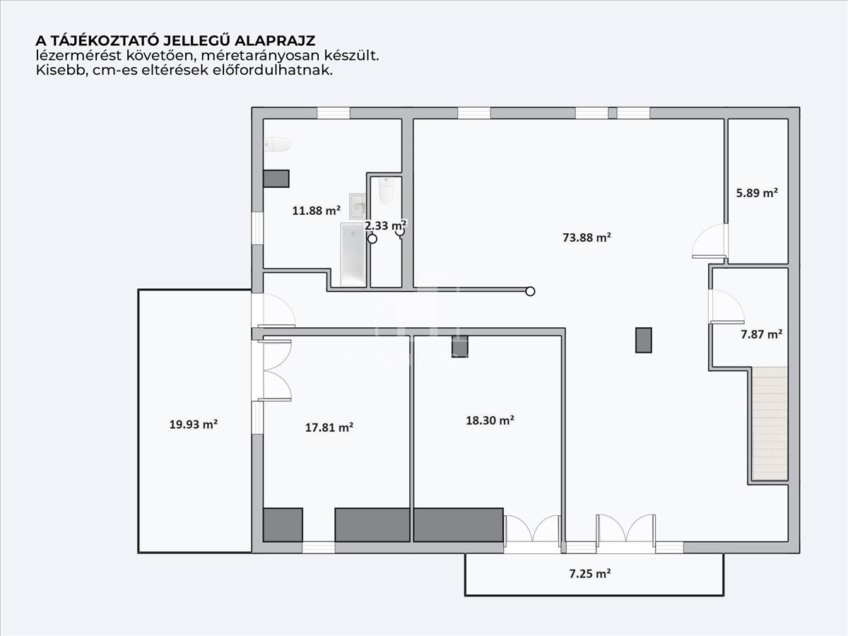 - 15 m2-es előszoba és lépcsőház található – innen jutunk az emeletre. Az itt található lépcső most csak egy ideiglenes megoldás, a lépcsőház ízlés szerint még alakítható – ehhez minden elő van készítve – a födém úgy van kibontva, hogy a feljáró könnyen alakítható legyen.