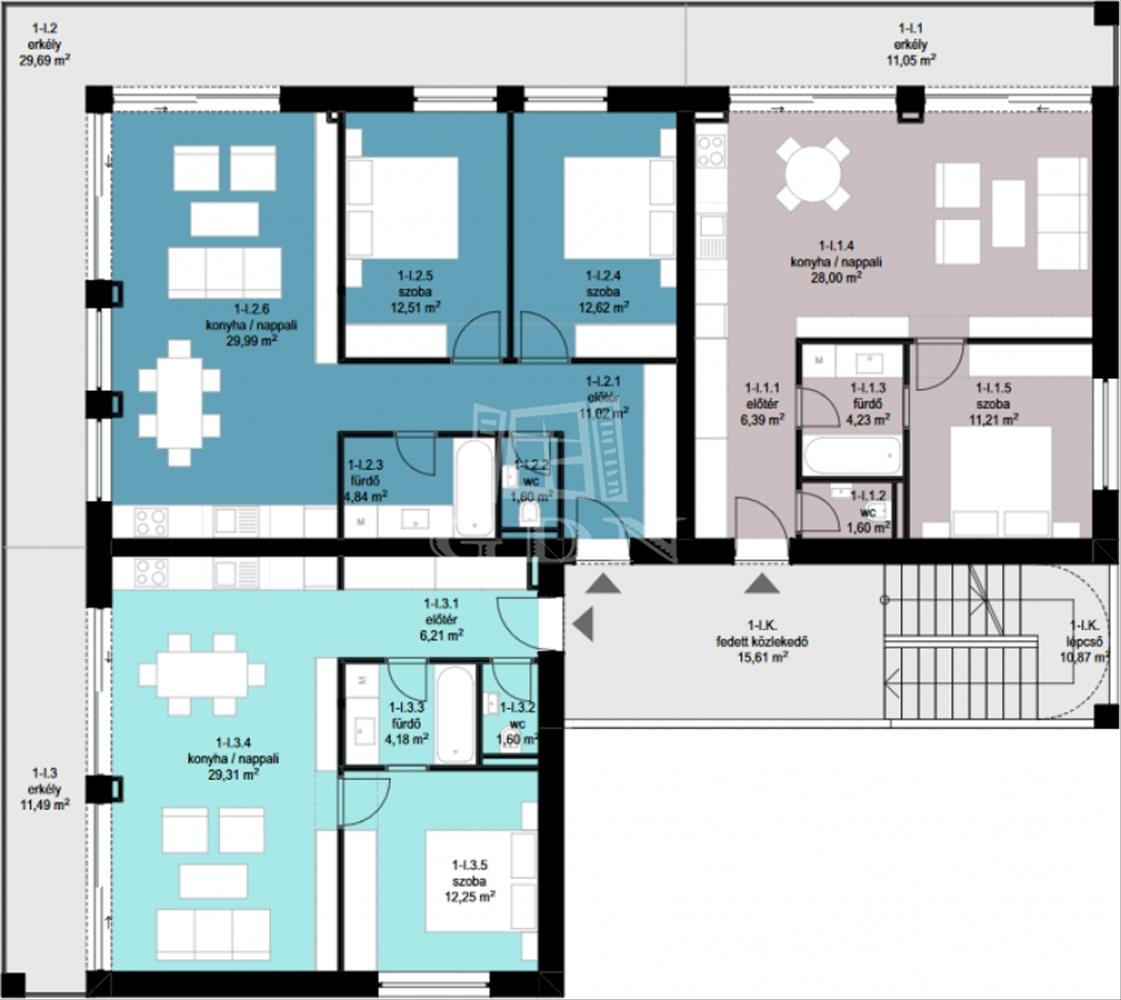 A lakás az első emeleten található. 54 Nm lakótér, 11 nm terasz. Amerikai konyhás nappali, hálószoba, közlekedő/gardrób, fürdőszoba, WC.
