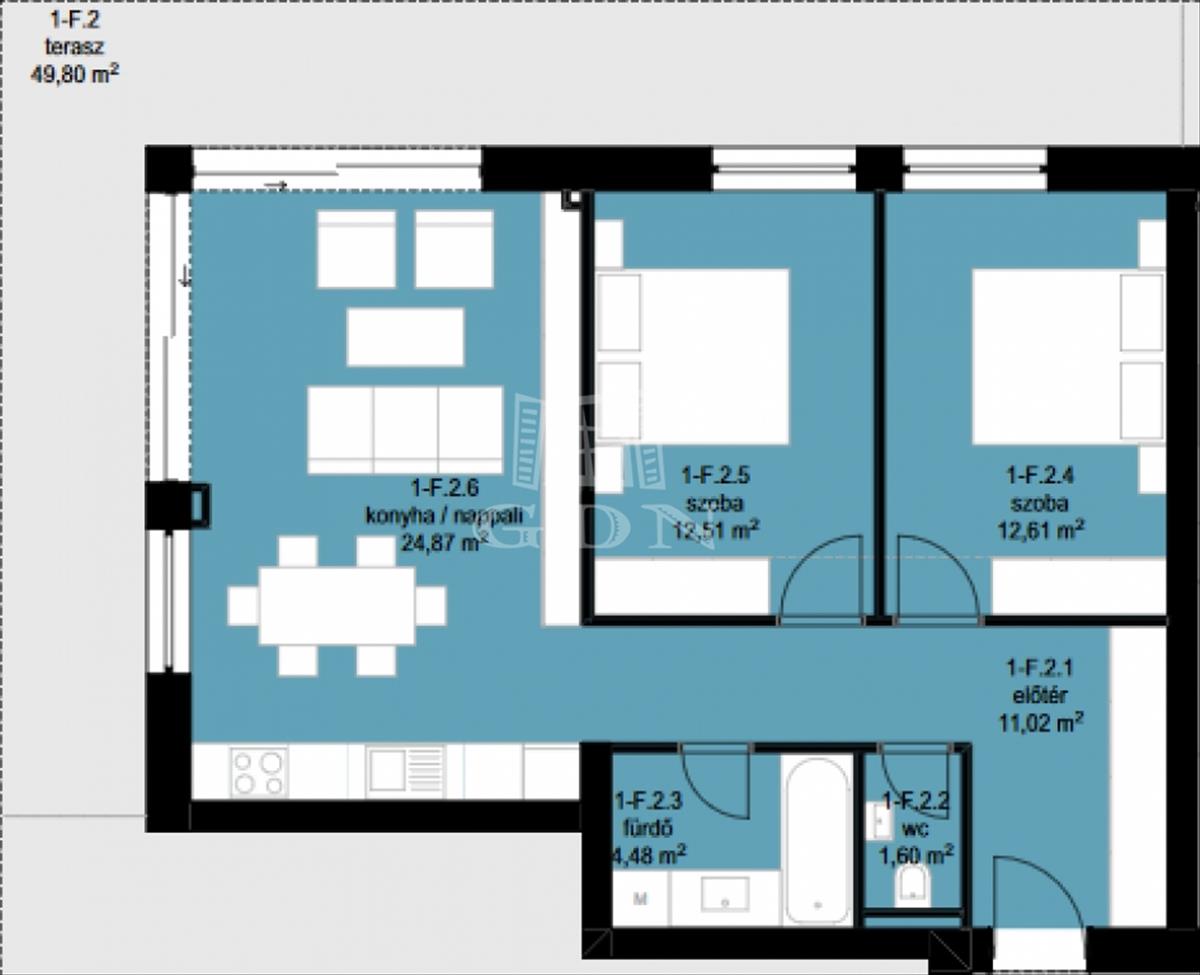 A lakás a földszinten található. 67 Nm lakótér, 50 nm terasz, kertkapcsolat. Amerikai konyhás nappali, 2 hálószoba, közlekedő/gardrób, fürdőszoba, WC.