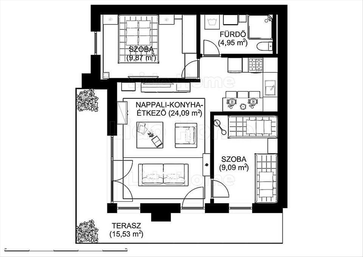 - nappali-konyha-étkező ( egy térben), két szoba, fürdőszoba, terasz helyiségkiosztású