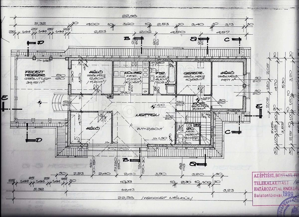 -Nappali + 4 szoba, fürdőszoba, konyha, étkező, közlekedő, ht. Helyiség, fedett terasz, lépcsőház és tároló.