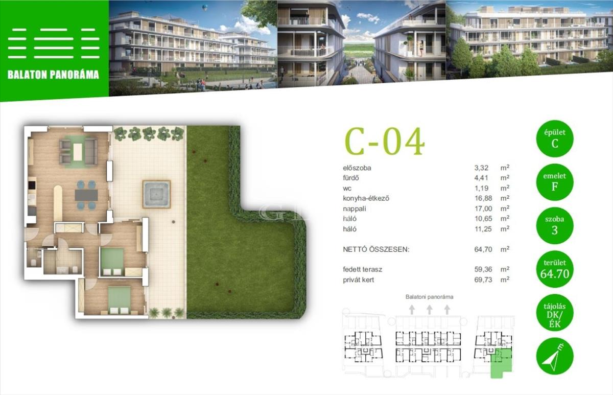 Ez a lakás nappali+2 hálós, 72nm alapterületű+ tartozik hozzá egy 59nm-es fedett terasz és 70nm privát kert is.