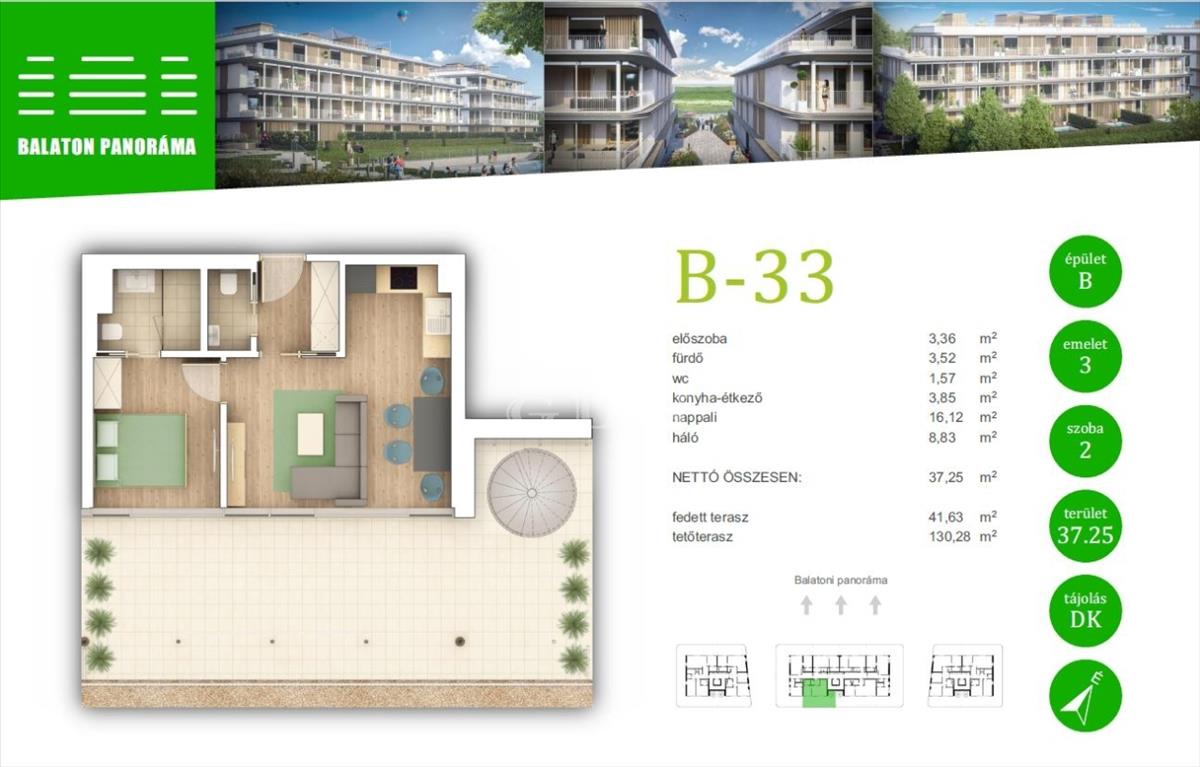 Ez a lakás nappali+ 1hálós, 37nm alapterületű+ tartozik hozzá egy 42nm-es és a tetőszinten található130nm-es zöld terasz is.