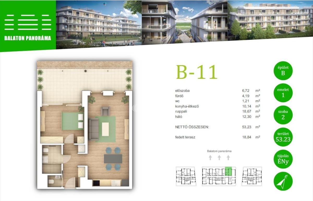 Ez a lakás nappali+1 hálós, 53nm alapterületű+ tartozik hozzá egy 19nm-es fedett terasz is.