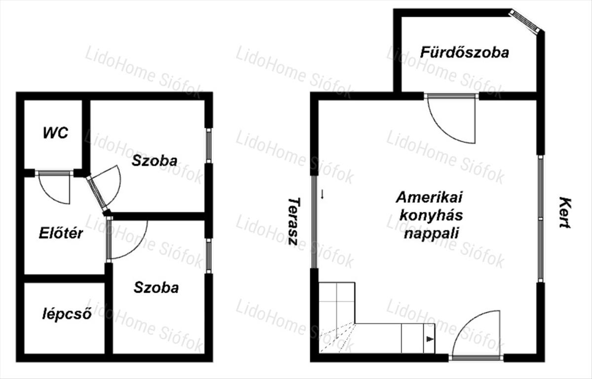 --földszinten: amerikai konyhás terasz- és kertkapcsolatos nappali étkezővel és zuhanyzós fürdőszoba wc-vel.