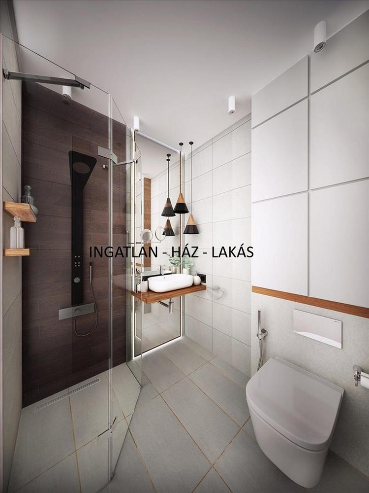 fürdőszoba: kerámia szürke burkolat, beépített automata tartályos wc, zuhanytálca és kabin.
