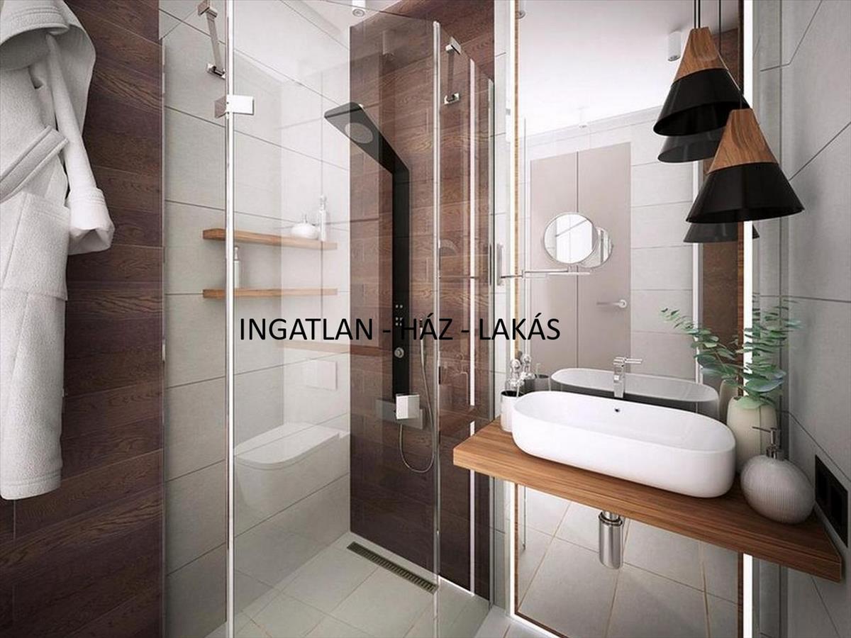 fürdőszoba: kerámia szürke burkolat, beépített automata tartályos wc, zuhanytálca és kabin.