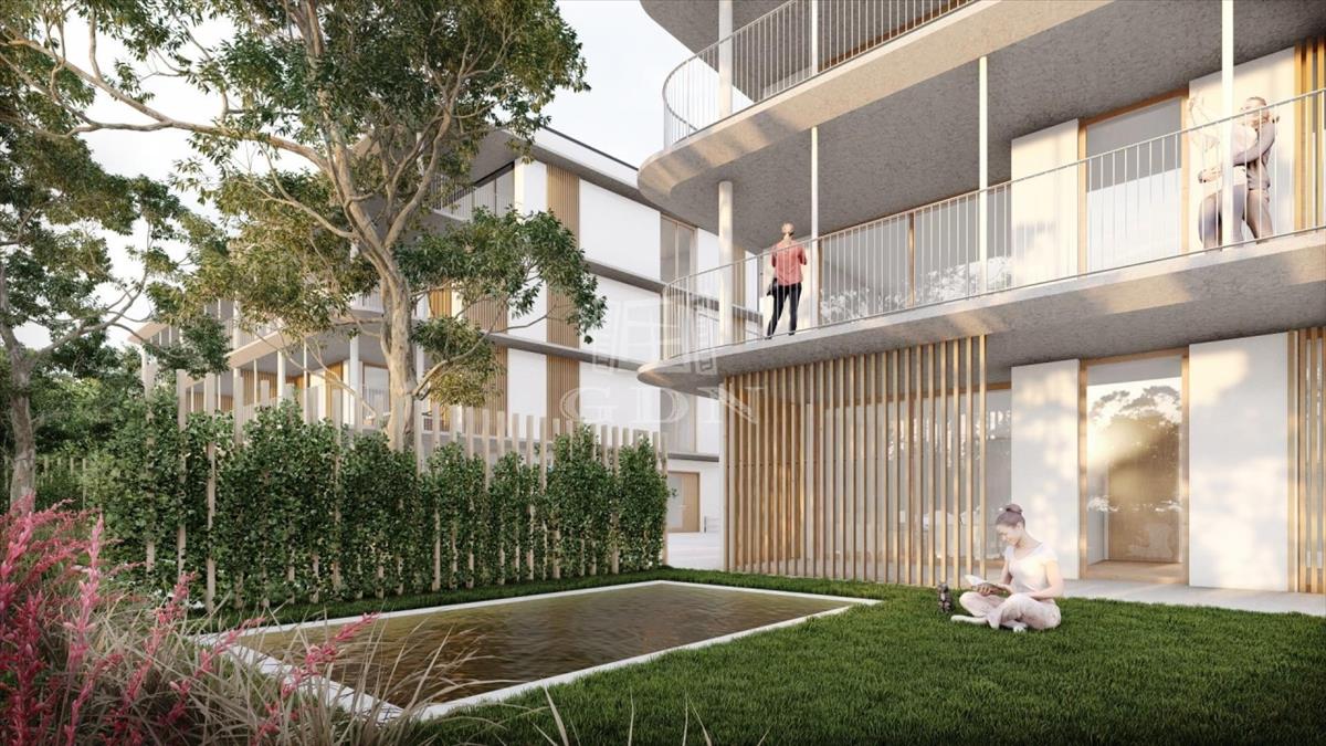 A lakásokhoz mindegyik szárnyon burkolt kialakítású lapos tetős teraszok készülnek. a földszinti lakásokhoz a teraszok mellett magánhasználatú kertrészek is csatlakoznak, a harmadik emeleten pedig épületszárnyanként 2-2 lakáshoz egy saját használatú zöldtetős tetőterasz is kapcsolódik. Zöldmezős beruházás, de a városépítészeti koncepció szerint a területre egy többemeletes, társasházas építészeti környezet lesz jellemző, amibe a tervezett épület is illeszkedik.