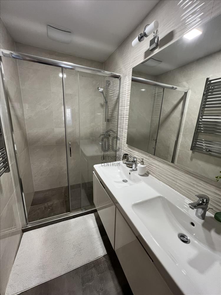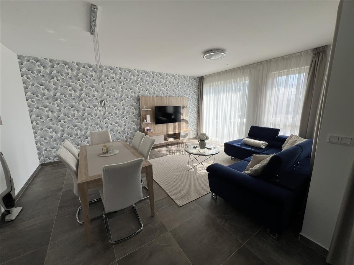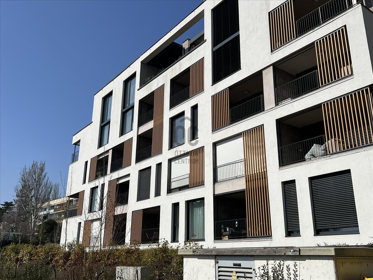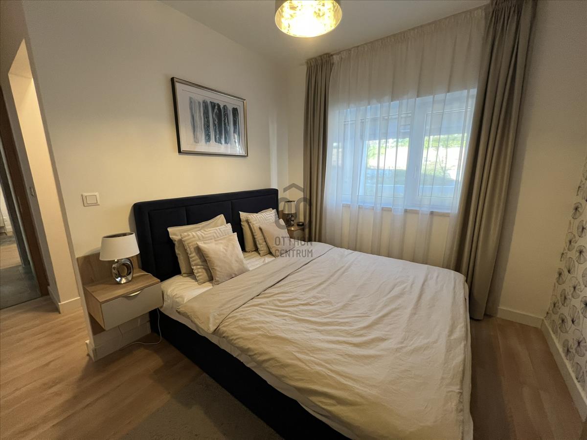 A lakás praktikus elrendezésű, beépített bútorokkal, valamint motoros redőnyökkel felszerelt. a nappaliból egy 15 m²-es terasz nyílik, ahonnan kellemes panoráma élvezhető.