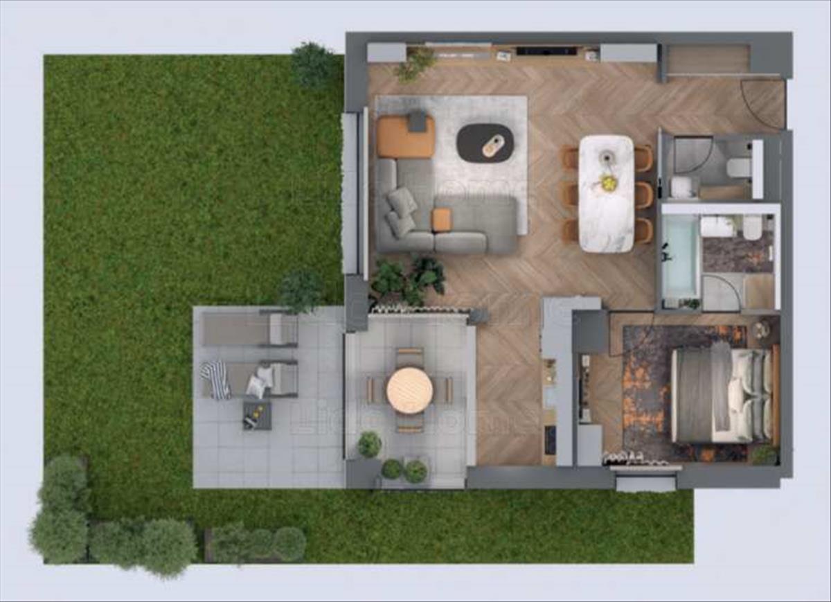 -Földszinti, szoba+nappalis lakás, 7, 2 m2-es loggiaval, 11 m2 terasszal, 60 m2 saját használatú kertrésszel.