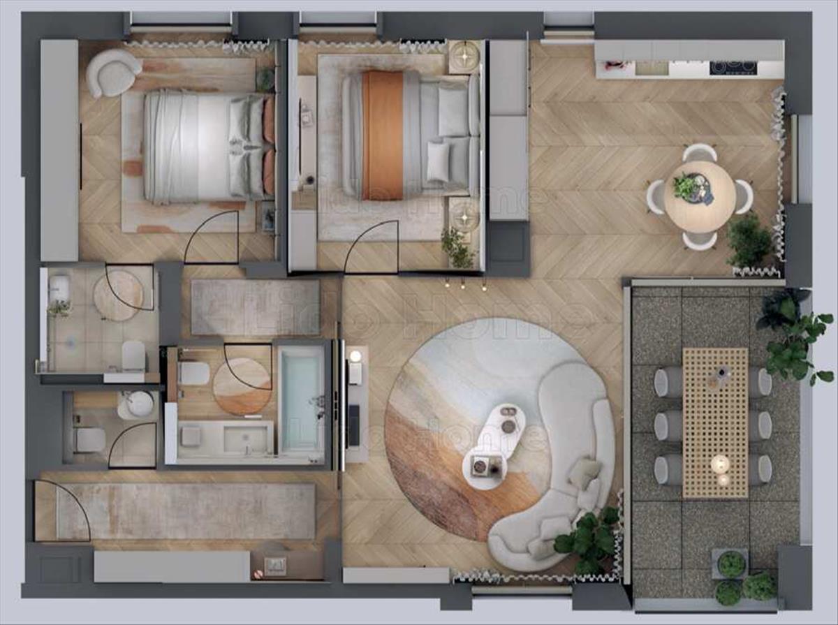 -2. emeleti, 2 szoba+nappalis lakás, 2 fürdőszobáva, 12, 53 m2-es loggiaval.
