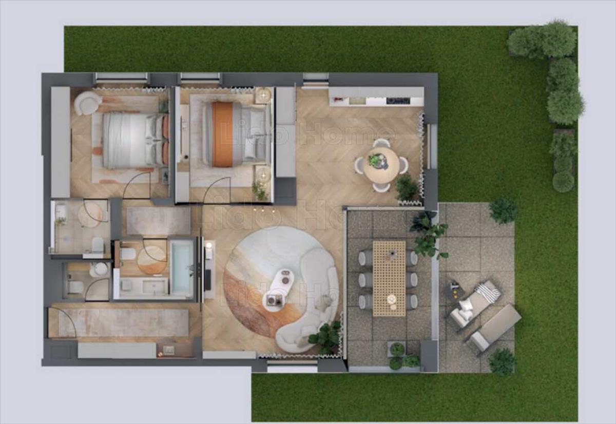 -Földszinti, 2 szoba+nappalis lakás, 2 fürdőszobával, 11 m2 loggiával, 16 m2 terasszal, 60, 26 m2 saját használatú kertrésszel.