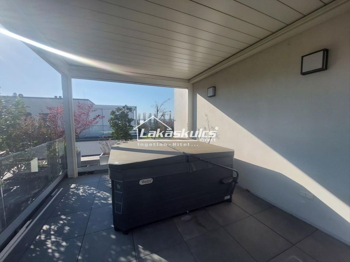 -az emeleti részen szeparáltan:hálószoba, gardrób, fürdőszoba, intim terasz, tetőkerttel, jacuzzival, lamellás árnyékolóval ahonnét a panorámában gyönyörködhetünk.