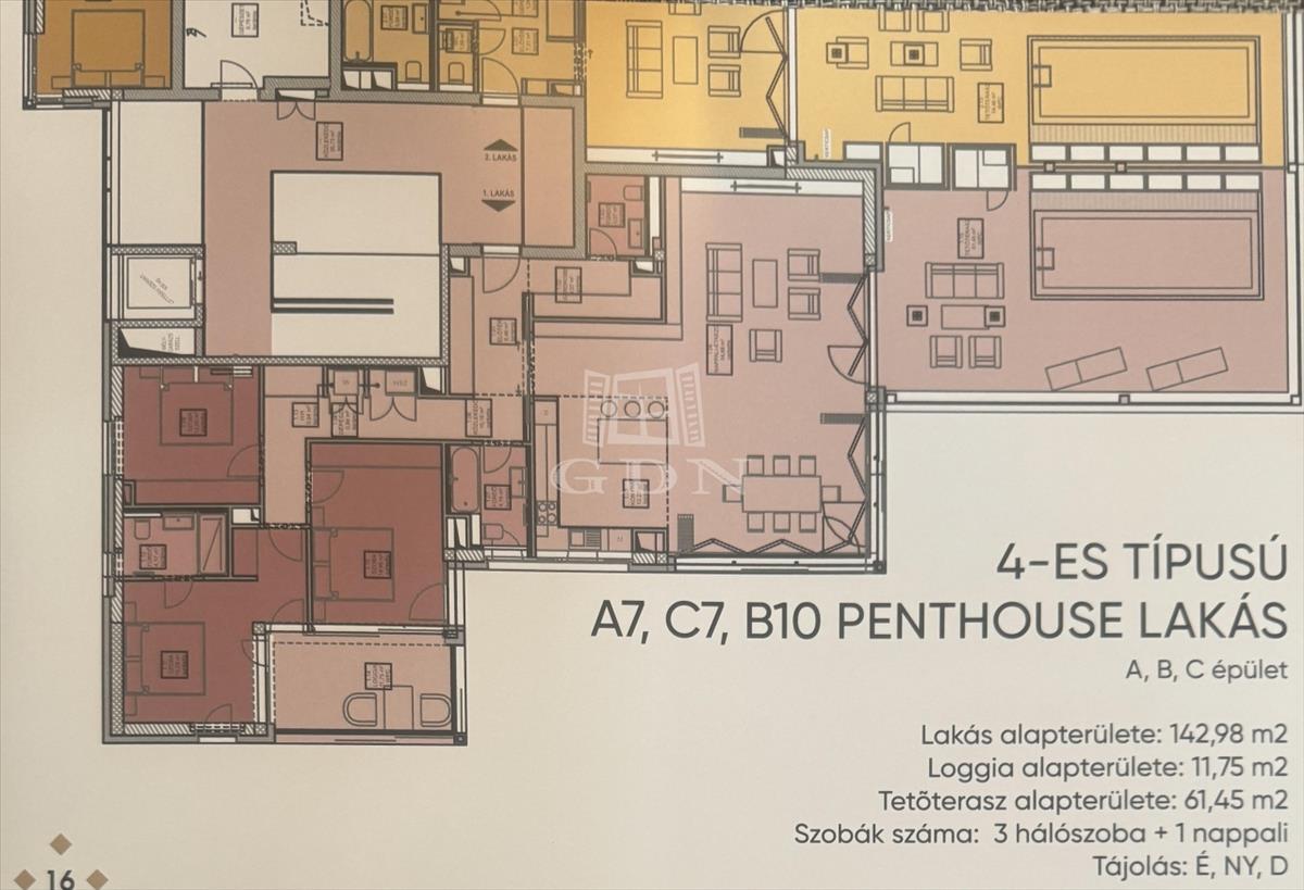 Az C/4-es típusú első emeleti lakás 115, 91 négyzetméteres, tartozik hozzá 2 loggia amelyek alapterülete 24, 75 négyzetméter. a 115, 91 négyzetméteren amerikai konyha, 3 hálószoba, nappali, gardróbszoba, 2 fürdőszoba, valamint vendég wc is található. a loggián napozhat vagy akár egy jakuzzit is telepíthet. Az ingatlanhoz mélygarázsok és tárolok is megvásárolhatóak.