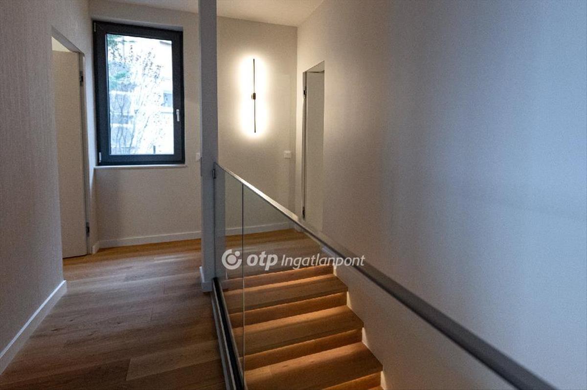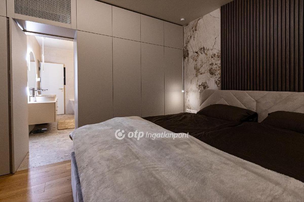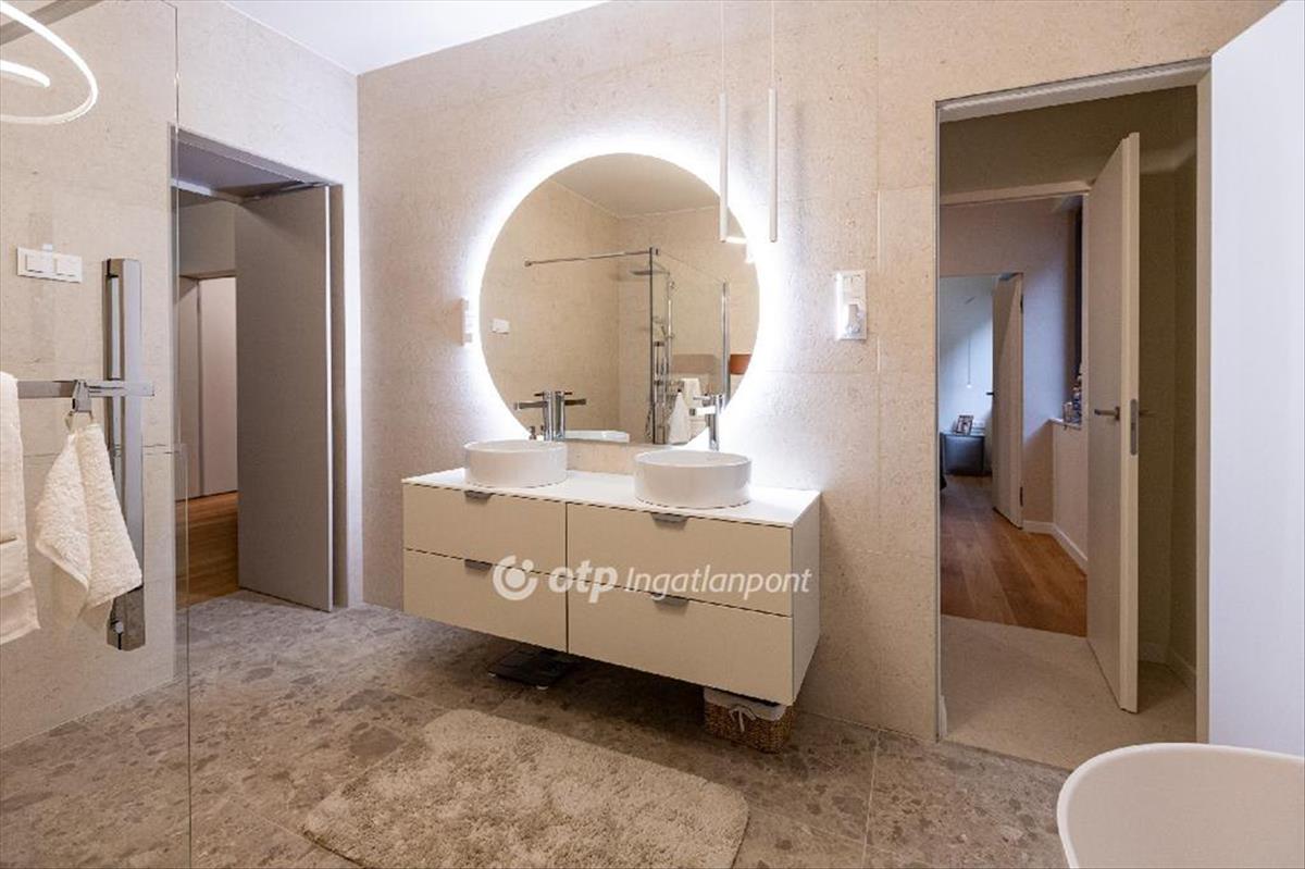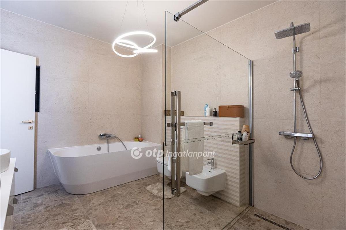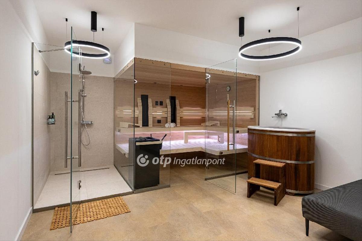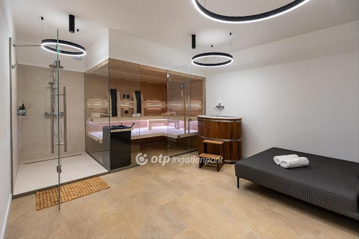 Az alsó szinten egy teljes értékű, külön bejárattal rendelkező 104 nm -es apartman kapott helyet, közvetlen kert- és medencekapcsolattal. Az amerikai konyhás nappali, két hálószoba, gardrób és fürdő ideális megoldás vendégek számára, többgenerációs használatra vagy akár önálló hasznosításra. Itt található a ház privát wellness része is: szauna, dézsa, pihenőtér, valamint egy hangulatos borospince és egy sokoldalúan használható helyiség, amely akár edzőteremként is funkcionálhat.