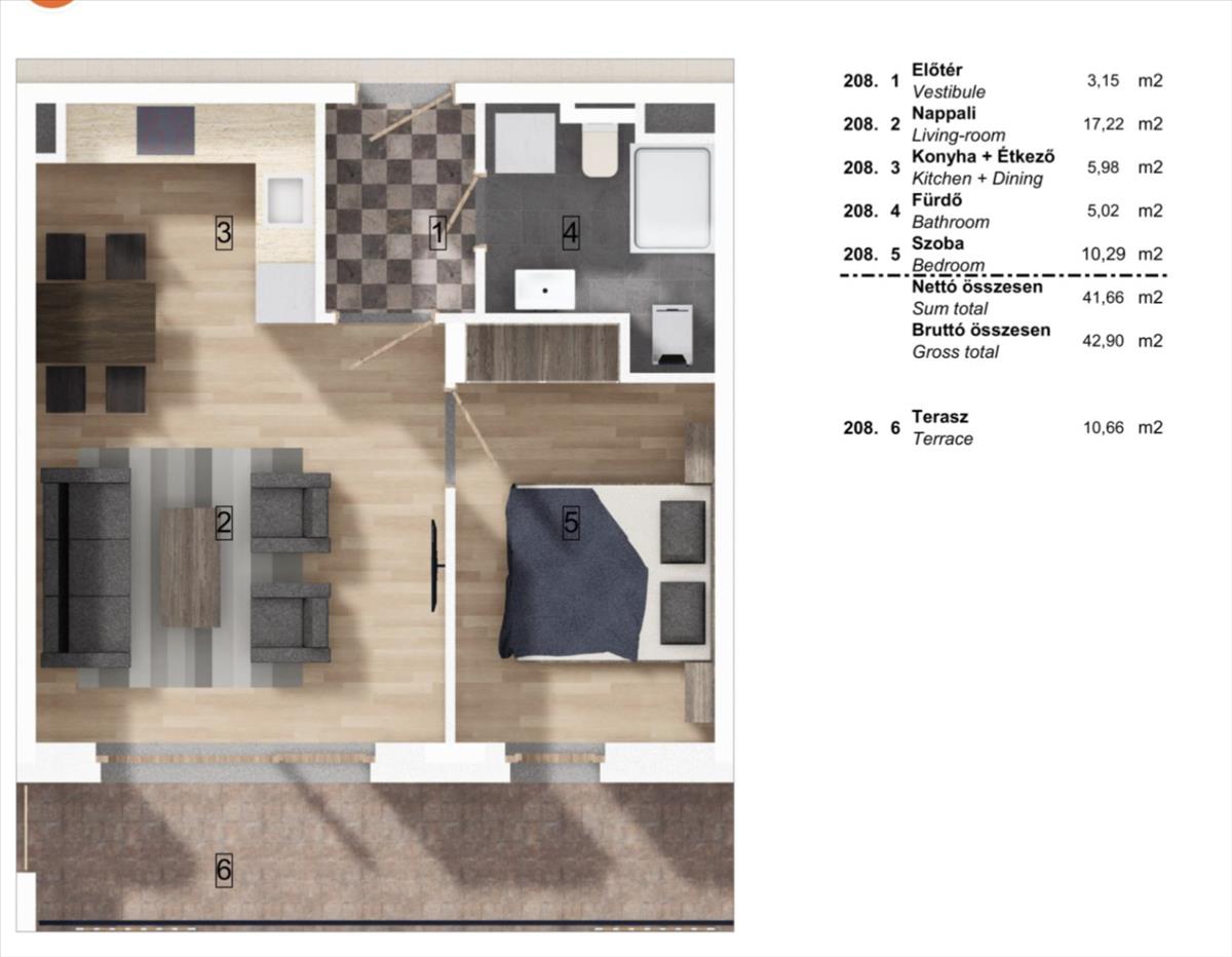 A lakás 43m2, 10m2-es terasszal