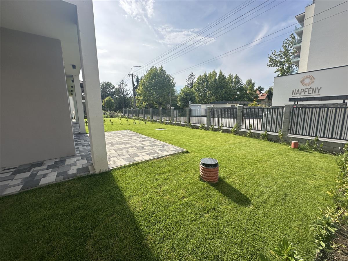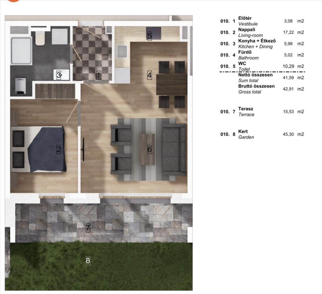 A lakás. 43m2, 15m2 terasszal és 45m2 saját kerttel.