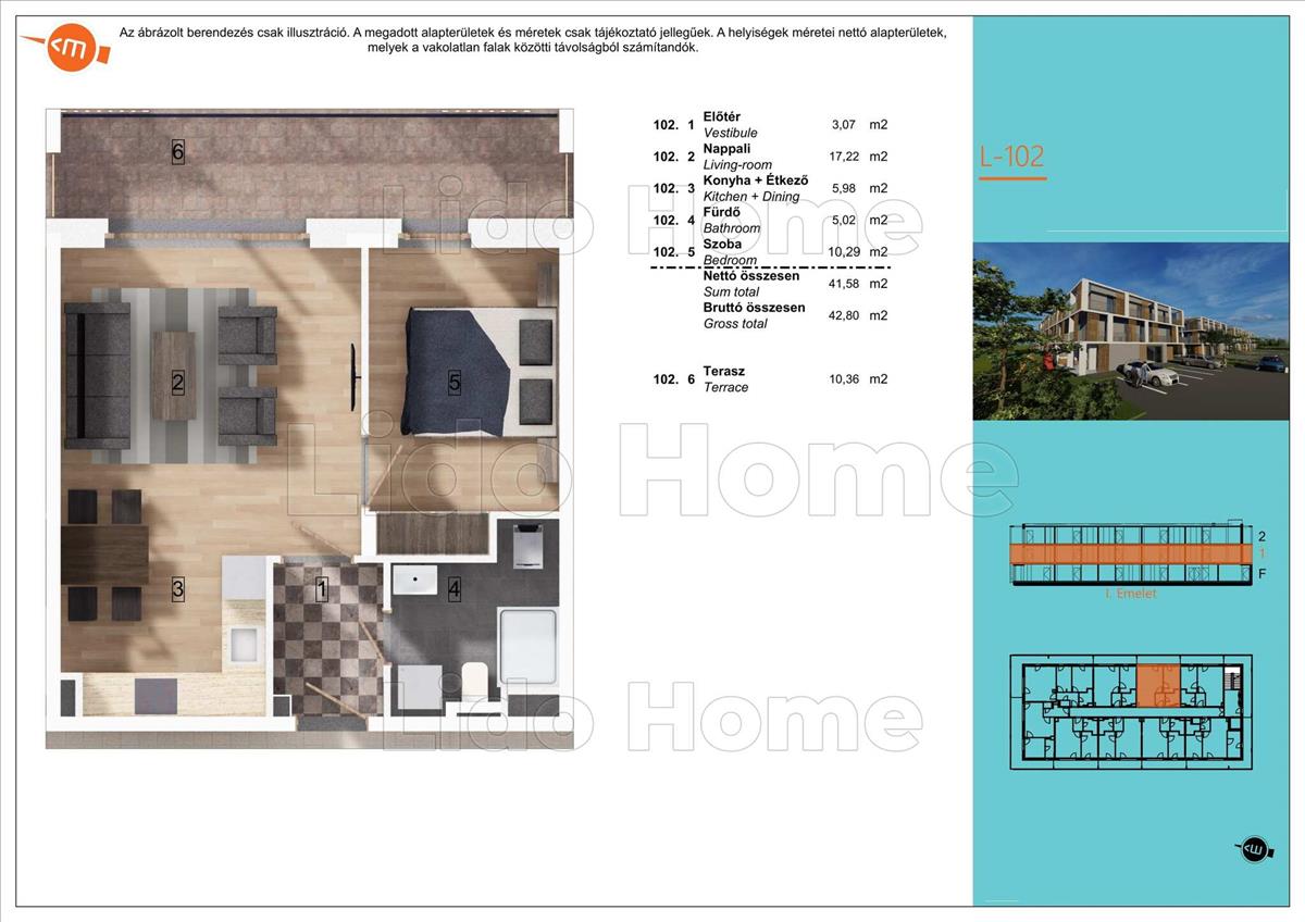 Az első emeleti, keleti tájolású lakás hasznos alapterülete: 42, 80 m2, terasz: 10, 36 m2.