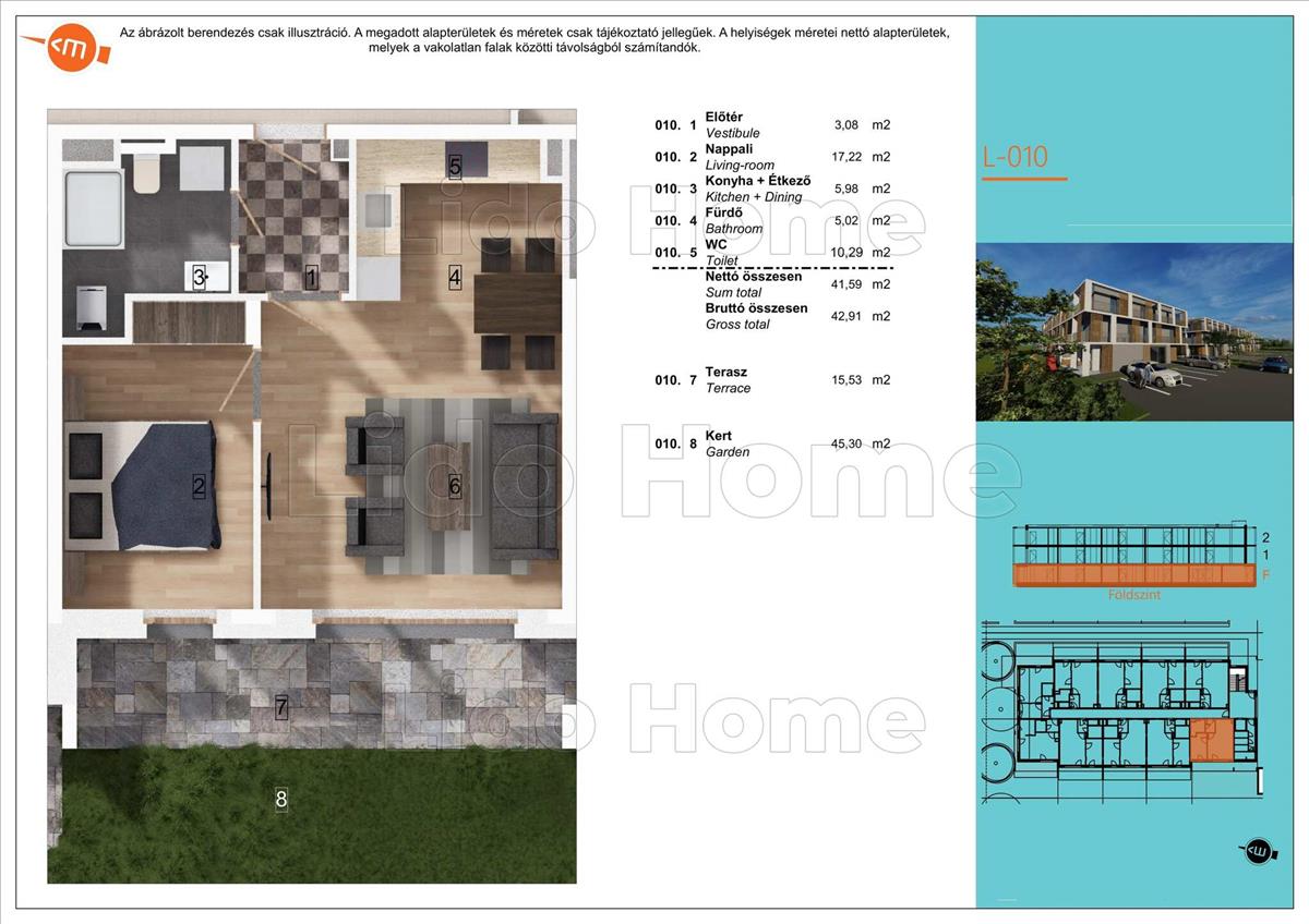 A földszinti, keleti tájolású lakás hasznos alapterülete: 42, 91 m2, terasz: 15, 53 m2, hozzá tartozó kertrész: 45, 30 m2.