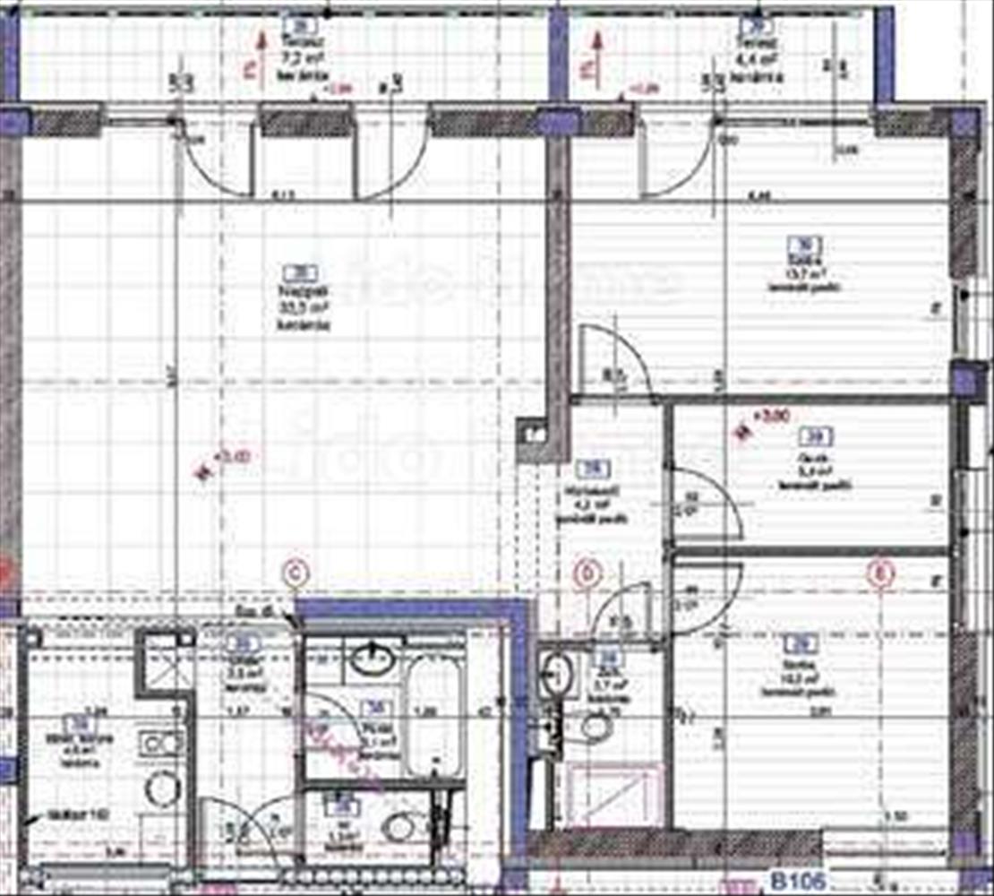 - Előtér, konyha, tágas nappali, három szoba, két fürdőszoba ( egy zuhanyzós és egy kádas), mellékhelyiség, közlekedő helyiségkiosztású