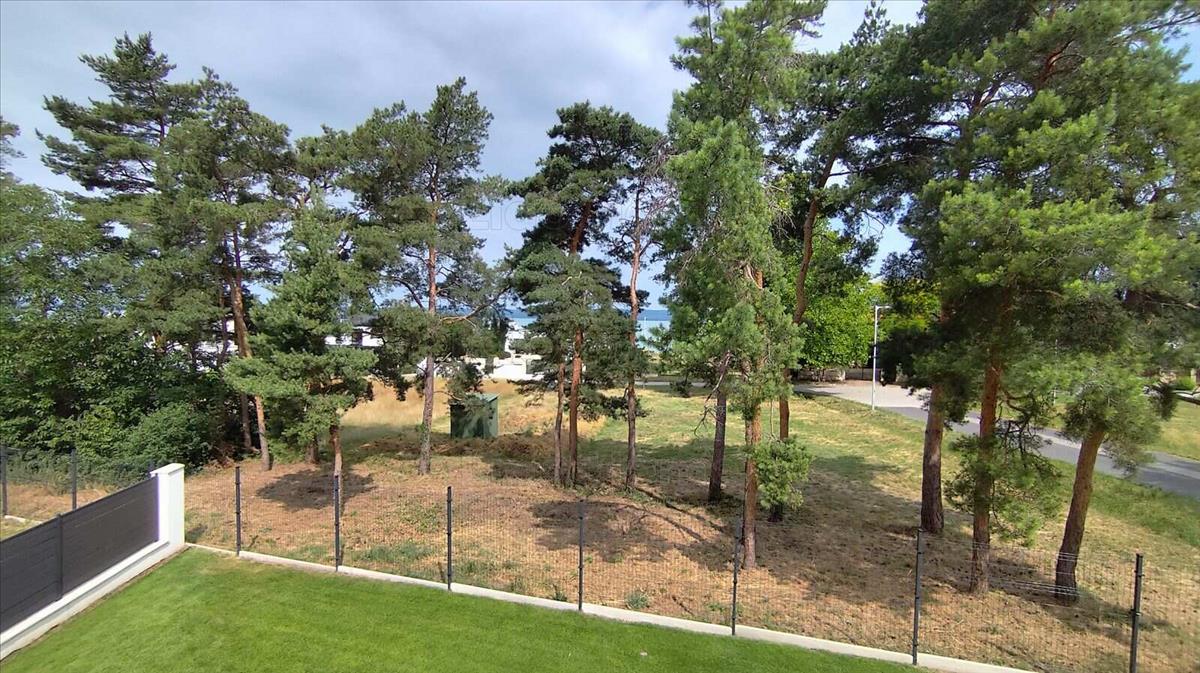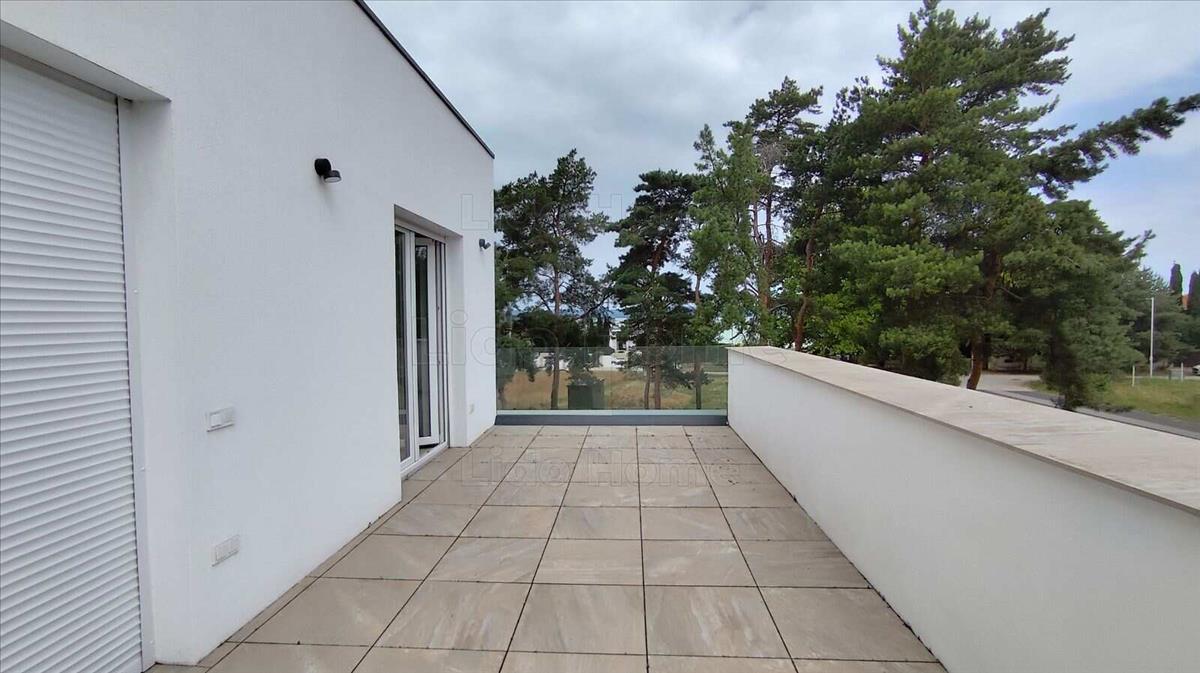 A kimagasló minőségű anyagokból épült lakás emeleti teraszáról napfényes rész-panorámás kilátás nyílik a Balatonra.