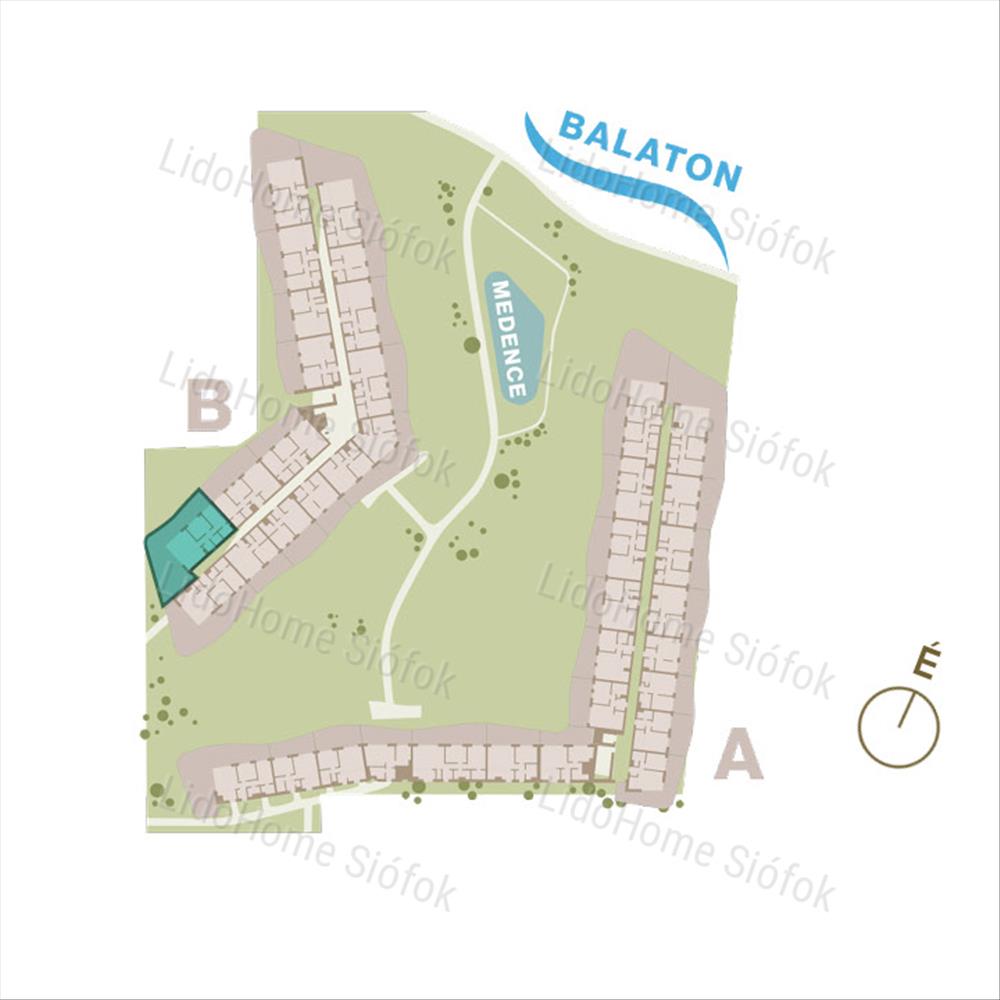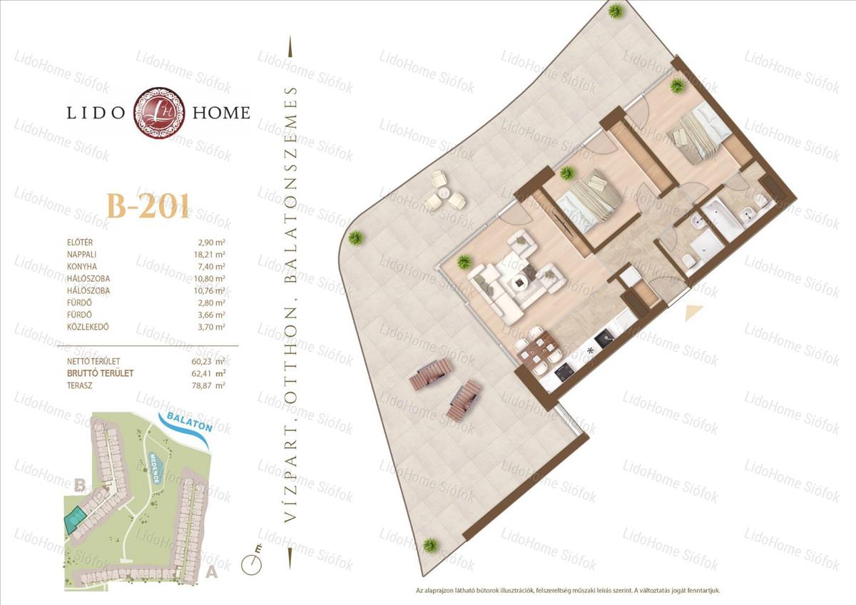 -Elosztása: Nappali + 2 hálószoba teraszkapcsolattal, konyha, 2 fürdő wc-vel, előtér és közlekedő.