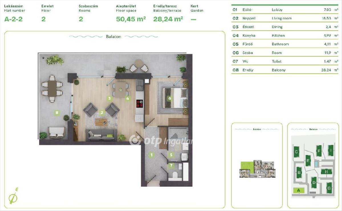 Balaton Déli part, Balatonszemes, közvetlen vízparti, 65 m2 lakás eladó. Az ingatlan a Balaton egyik legszebb vízparti lakóparkjában, természetes zöld környezetben található. a környezettudatosan épült, panorámás kilátást nyújtó, modern épületek esztétikailag és a fenntarthatóság szempontjából is kiemelkedőek, egyszerre biztosítják a kényelmes otthont és a balatoni életstílust. a különböző lakástípusok lehetőséget adnak arra, hogy minden lakó megtalálja a számára tökéletes otthont, akár az Otthon Start Hitelprogram keretében is. a földszinti lakások terasszal és kertkapcsolattal rendelkeznek, az épületek felső emeletén penthouse lakás került kialakításra. Ehhez az 51 m2-es 2. emeleti lakáshoz kis tároló és egy 28 m2-es erkély tartozik. a lakópark nem csak elhelyezkedése miatt egyedi, minden egyes lakás a legújabb intelligens technológiával, magas minőségű és igényes alapanyagokkal, prémium extrákkal kerül kialakításra. Egyszerre komfortosak és energiahatékonyak: elektromos redőnyök, szúnyogháló, egyedileg vezérelhető hőszivattyús, fan-coilos hűtési és fűtési rendszer, okosotthon rendszer, beléptető rendszer, riasztórendszer. Az ingatlan értékét növelik a következő szolgáltatások: a területen kialakított gondnoki, üzemeltetési iroda; zöldterületbe illesztett játszótér; zárt, privát vízpart több, mint 130 méteren; partmenti stég; közel 120 m2 vízfelületű strandmedence 16 m2-es gyermekpancsolóval; automata öntözőhálózat a lakóépületek közötti zöldfelületek öntözésére. OTP Ingatlanpont és Pénzügyi Pont irodánk teljeskörű támogatást nyújt az ingatlan kiválasztásával, megvételével, biztosításával és finanszírozásával, akár egyedi kedvezményes hitelekkel, befektetési lehetőségekkel kapcsolatban is. Bővebb információért keressen telefonon! Hitel.hu - Hasonlítsa össze a bankok lakáshitel ajánlatait