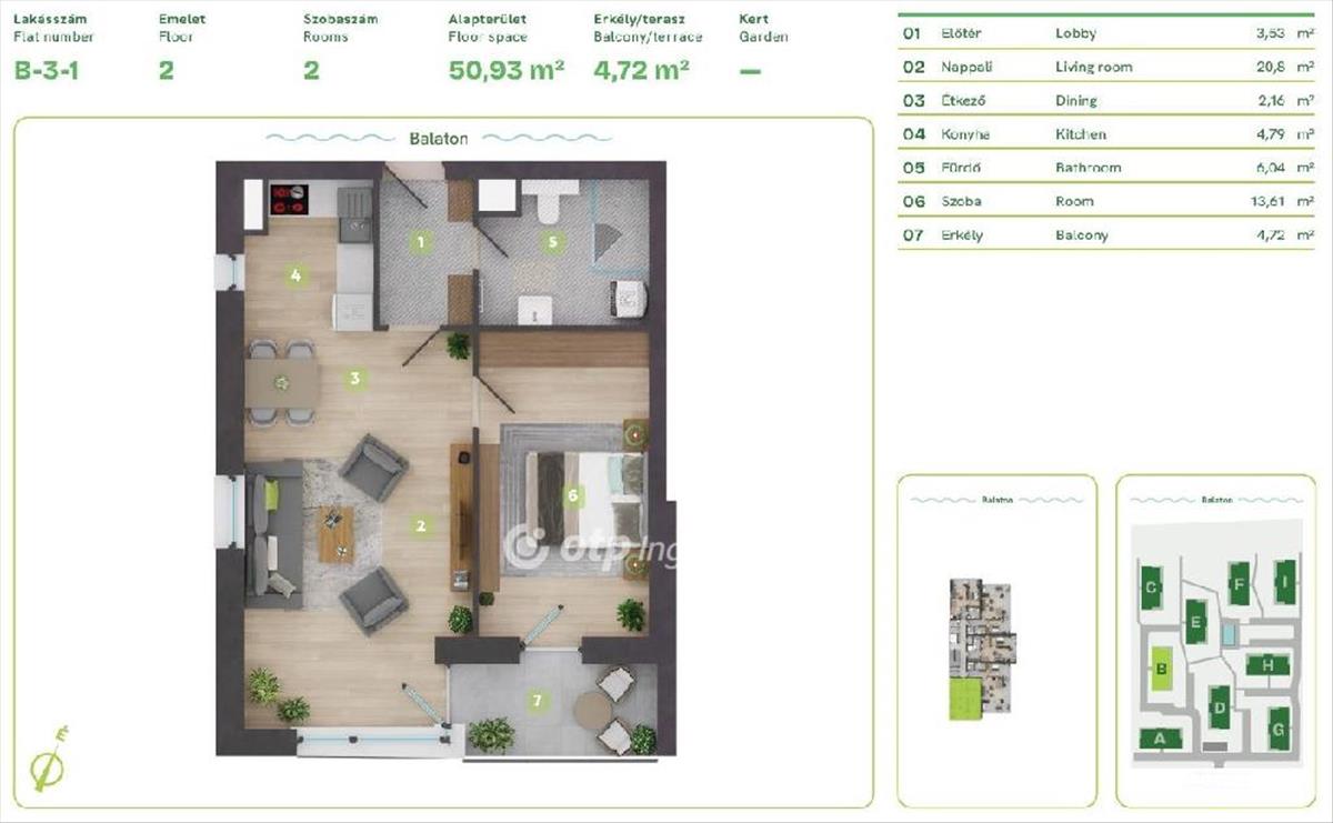 Balaton Déli part, Balatonszemes, közvetlen vízparti, 61 m2 lakás eladó. Az ingatlan a Balaton egyik legszebb vízparti lakóparkjában, természetes zöld környezetben található. a környezettudatosan épült, panorámás kilátást nyújtó, modern épületek esztétikailag és a fenntarthatóság szempontjából is kiemelkedőek, egyszerre biztosítják a kényelmes otthont és a balatoni életstílust. a különböző lakástípusok lehetőséget adnak arra, hogy minden lakó megtalálja a számára tökéletes otthont, akár az Otthon Start Hitelprogram keretében is. a földszinti lakások terasszal és kertkapcsolattal rendelkeznek, az épületek felső emeletén penthouse lakás került kialakításra. Ehhez az 53 m2-es 3. emeleti lakáshoz kis tároló, 4, 7 m2 erkély tartozik. a lakópark nem csak elhelyezkedése miatt egyedi, minden egyes lakás a legújabb intelligens technológiával, magas minőségű és igényes alapanyagokkal, prémium extrákkal kerül kialakításra. Egyszerre komfortosak és energiahatékonyak: elektromos redőnyök, szúnyogháló, egyedileg vezérelhető hőszivattyús, fan-coilos hűtési és fűtési rendszer, okosotthon rendszer, beléptető rendszer, riasztórendszer. Az ingatlan értékét növelik a következő szolgáltatások: a területen kialakított gondnoki, üzemeltetési iroda; zöldterületbe illesztett játszótér; zárt, privát vízpart több, mint 130 méteren; partmenti stég; közel 120 m2 vízfelületű strandmedence 16 m2-es gyermekpancsolóval; automata öntözőhálózat a lakóépületek közötti zöldfelületek öntözésére. OTP Ingatlanpont és Pénzügyi Pont irodánk teljeskörű támogatást nyújt az ingatlan kiválasztásával, megvételével, biztosításával és finanszírozásával, akár egyedi kedvezményes hitelekkel, befektetési lehetőségekkel kapcsolatban is. Bővebb információért keressen telefonon! Hitel.hu - Hasonlítsa össze a bankok lakáshitel ajánlatait