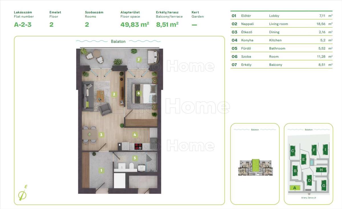 A 2. emeleti, északi tájolású lakás hasznos alapterülete: 49, 83 m2, a hozzá tartozó terasz: 8, 51 m2.