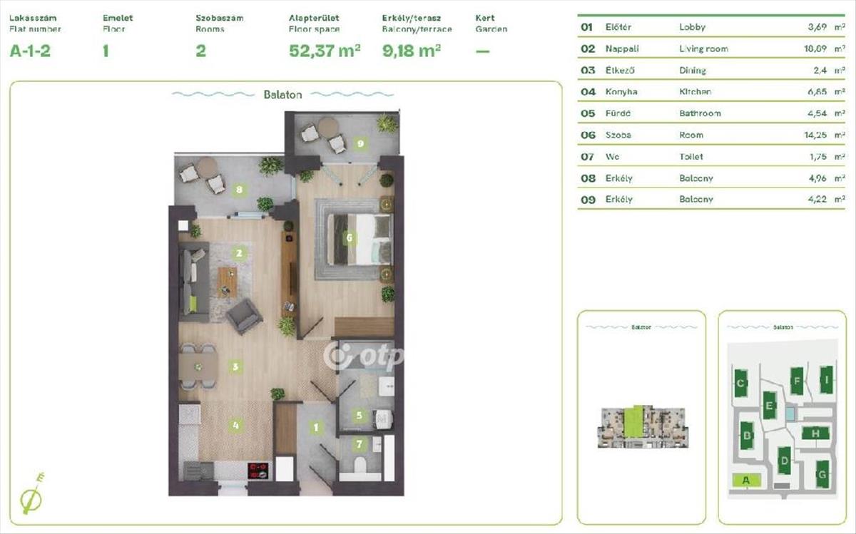 Balaton Déli part, Balatonszemes, közvetlen vízparti, 57 m2 lakás eladó. Az ingatlan a Balaton egyik legszebb vízparti lakóparkjában, természetes zöld környezetben található. a környezettudatosan épült, panorámás kilátást nyújtó, modern épületek esztétikailag és a fenntarthatóság szempontjából is kiemelkedőek, egyszerre biztosítják a kényelmes otthont és a balatoni életstílust. a különböző lakástípusok lehetőséget adnak arra, hogy minden lakó megtalálja a számára tökéletes otthont, akár az Otthon Start Hitelprogram keretében is. a földszinti lakások terasszal és kertkapcsolattal rendelkeznek, az épületek felső emeletén penthouse lakás került kialakításra. Ehhez az 52 m2-es 1. emeleti lakáshoz kis tároló és két, összesen 9 m2 erkély tartozik. a lakópark nem csak elhelyezkedése miatt egyedi, minden egyes lakás a legújabb intelligens technológiával, magas minőségű és igényes alapanyagokkal, prémium extrákkal kerül kialakításra. Egyszerre komfortosak és energiahatékonyak: elektromos redőnyök, szúnyogháló, egyedileg vezérelhető hőszivattyús, fan-coilos hűtési és fűtési rendszer, okosotthon rendszer, beléptető rendszer, riasztórendszer. Az ingatlan értékét növelik a következő szolgáltatások: a területen kialakított gondnoki, üzemeltetési iroda; zöldterületbe illesztett játszótér; zárt, privát vízpart több, mint 130 méteren; partmenti stég; közel 120 m2 vízfelületű strandmedence 16 m2-es gyermekpancsolóval; automata öntözőhálózat a lakóépületek közötti zöldfelületek öntözésére. OTP Ingatlanpont és Pénzügyi Pont irodánk teljeskörű támogatást nyújt az ingatlan kiválasztásával, megvételével, biztosításával és finanszírozásával, akár egyedi kedvezményes hitelekkel, befektetési lehetőségekkel kapcsolatban is. Bővebb információért keressen telefonon!