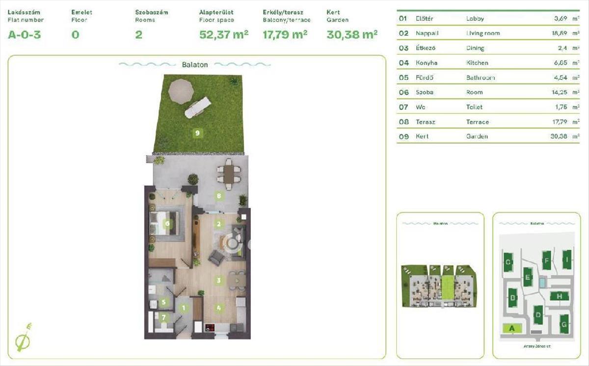 Balaton Déli part, Balatonszemes, közvetlen vízparti, 61 m2 lakás eladó. Az ingatlan a Balaton egyik legszebb vízparti lakóparkjában, természetes zöld környezetben található. a környezettudatosan épült, panorámás kilátást nyújtó, modern épületek esztétikailag és a fenntarthatóság szempontjából is kiemelkedőek, egyszerre biztosítják a kényelmes otthont és a balatoni életstílust. a különböző lakástípusok lehetőséget adnak arra, hogy minden lakó megtalálja a számára tökéletes otthont, akár az Otthon Start Hitelprogram keretében is. a földszinti lakások terasszal és kertkapcsolattal rendelkeznek, az épületek felső emeletén penthouse lakás került kialakításra. Ehhez az 52 m2-es földszinti lakáshoz 18 m2 terasz és 30 m2 saját kert tartozik. a lakópark nem csak elhelyezkedése miatt egyedi, minden egyes lakás a legújabb intelligens technológiával, magas minőségű és igényes alapanyagokkal, prémium extrákkal kerül kialakításra. Egyszerre komfortosak és energiahatékonyak: elektromos redőnyök, szúnyogháló, egyedileg vezérelhető hőszivattyús, fan-coilos hűtési és fűtési rendszer, okosotthon rendszer, beléptető rendszer, riasztórendszer. Az ingatlan értékét növelik a következő szolgáltatások: a területen kialakított gondnoki, üzemeltetési iroda; zöldterületbe illesztett játszótér; zárt, privát vízpart több, mint 130 méteren; partmenti stég; közel 120 m2 vízfelületű strandmedence 16 m2-es gyermekpancsolóval; automata öntözőhálózat a lakóépületek közötti zöldfelületek öntözésére. OTP Ingatlanpont és Pénzügyi Pont irodánk teljeskörű támogatást nyújt az ingatlan kiválasztásával, megvételével, biztosításával és finanszírozásával, akár egyedi kedvezményes hitelekkel, befektetési lehetőségekkel kapcsolatban is. Bővebb információért keressen telefonon! M31459296044370 Ft
