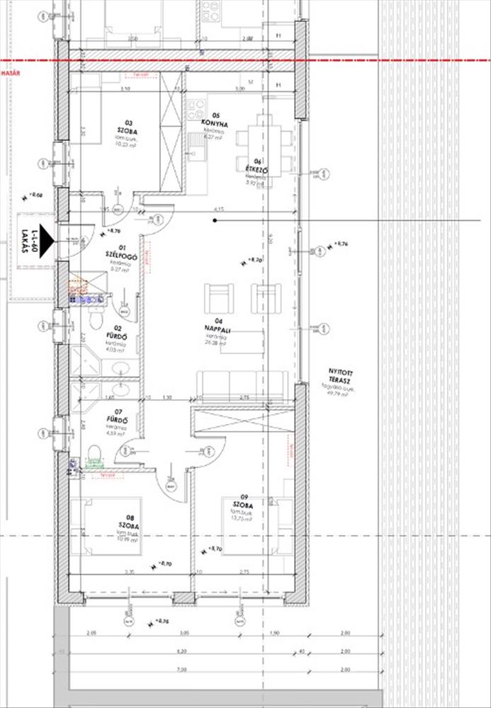 -a lakás területe 85, 33 m2 terület, melyhez 49, 79 m2-es nyitott terasz tartozik.