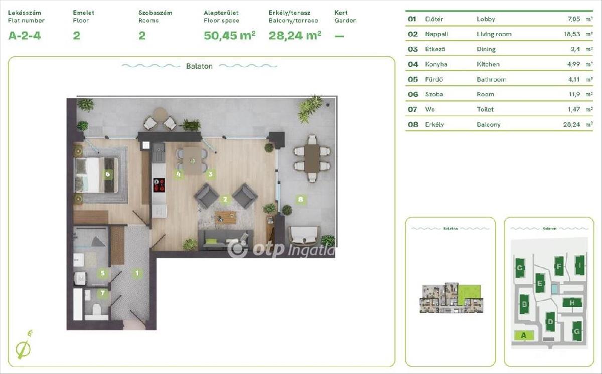 Balaton Déli part, Balatonszemes, közvetlen vízparti, 65 m2 lakás eladó. Az ingatlan a Balaton egyik legszebb vízparti lakóparkjában, természetes zöld környezetben található. a környezettudatosan épült, panorámás kilátást nyújtó, modern épületek esztétikailag és a fenntarthatóság szempontjából is kiemelkedőek, egyszerre biztosítják a kényelmes otthont és a balatoni életstílust. a különböző lakástípusok lehetőséget adnak arra, hogy minden lakó megtalálja a számára tökéletes otthont, akár az Otthon Start Hitelprogram keretében is. a földszinti lakások terasszal és kertkapcsolattal rendelkeznek, az épületek felső emeletén penthouse lakás került kialakításra. Ehhez az 51 m2-es 2. emeleti lakáshoz kis tároló és egy 28 m2-es erkély tartozik. a lakópark nem csak elhelyezkedése miatt egyedi, minden egyes lakás a legújabb intelligens technológiával, magas minőségű és igényes alapanyagokkal, prémium extrákkal kerül kialakításra. Egyszerre komfortosak és energiahatékonyak: elektromos redőnyök, szúnyogháló, egyedileg vezérelhető hőszivattyús, fan-coilos hűtési és fűtési rendszer, okosotthon rendszer, beléptető rendszer, riasztórendszer. Az ingatlan értékét növelik a következő szolgáltatások: a területen kialakított gondnoki, üzemeltetési iroda; zöldterületbe illesztett játszótér; zárt, privát vízpart több, mint 130 méteren; partmenti stég; közel 120 m2 vízfelületű strandmedence 16 m2-es gyermekpancsolóval; automata öntözőhálózat a lakóépületek közötti zöldfelületek öntözésére. OTP Ingatlanpont és Pénzügyi Pont irodánk teljeskörű támogatást nyújt az ingatlan kiválasztásával, megvételével, biztosításával és finanszírozásával, akár egyedi kedvezményes hitelekkel, befektetési lehetőségekkel kapcsolatban is. Bővebb információért keressen telefonon! Hitel.hu - Hasonlítsa össze a bankok lakáshitel ajánlatait
