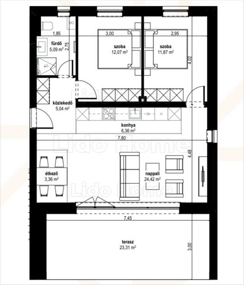 -Földszinti, 2 szoba+nappalis lakás, 23, 31 m2-es terasszal, 98 m2 saját kertrésszel.