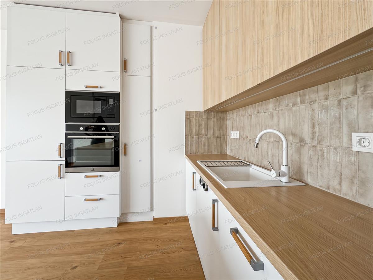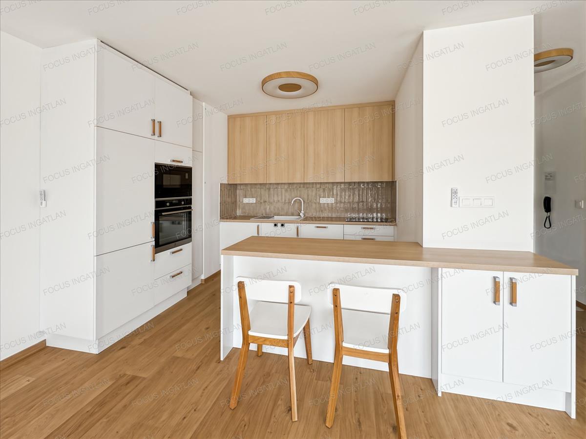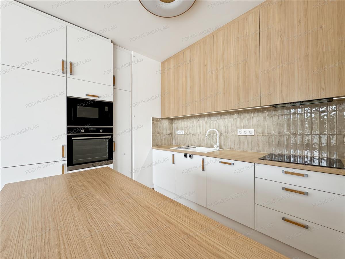 Prémium belső: Egyedi, gépesített konyha (beépített Electrolux gépekkel), elegáns fa és fehér felületek, beépített gardróbszekrények.